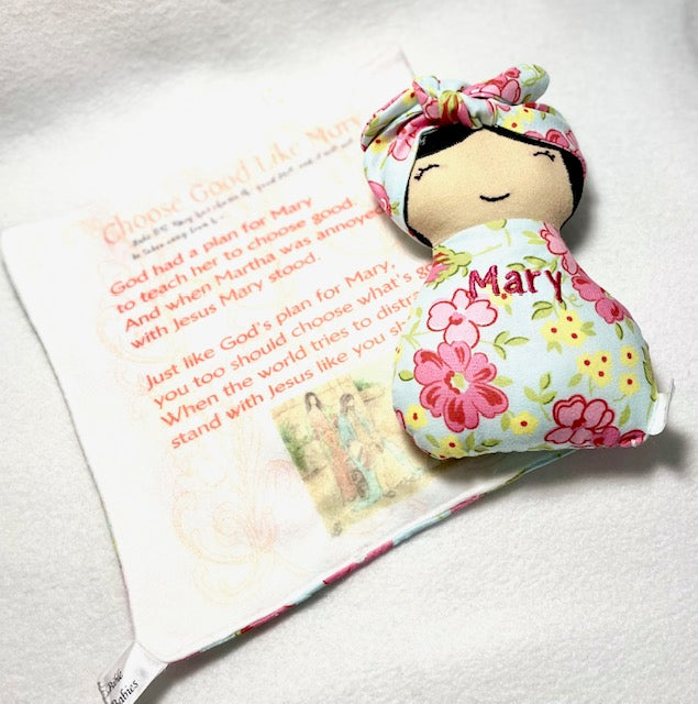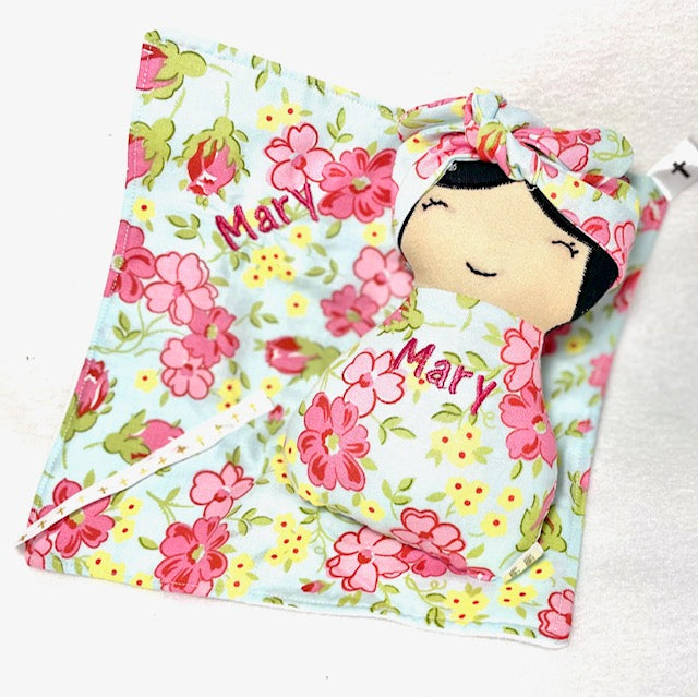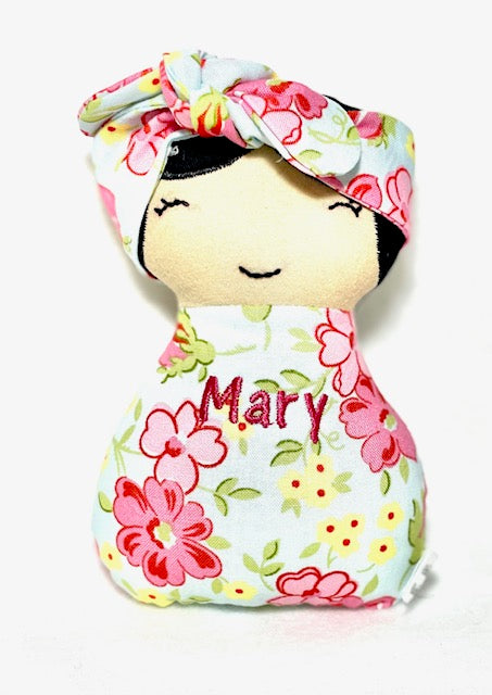 Baby Mary sister of Martha has a hand embroidered face. Her body and quilt back both have her name embroidered. The fabric is a beautiful bright summer floral made of 100% cotton.
